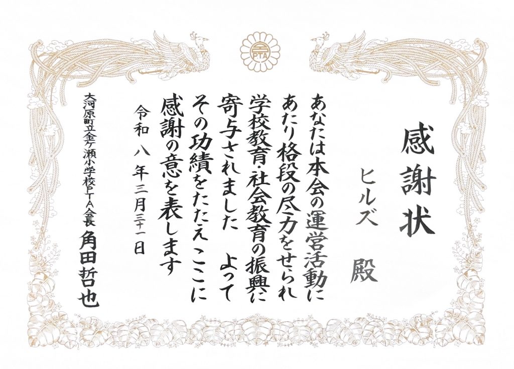 令和8年3月31日に開催されました大河原町立金ヶ瀬小学校PTA総会におきまして、感謝状の贈呈を受けましたのでご報告いたします。